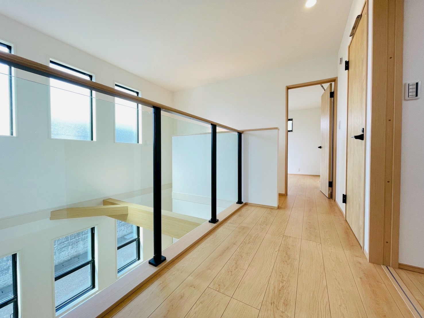 2階の廊下にはクリアな手すりがデザインされています♪