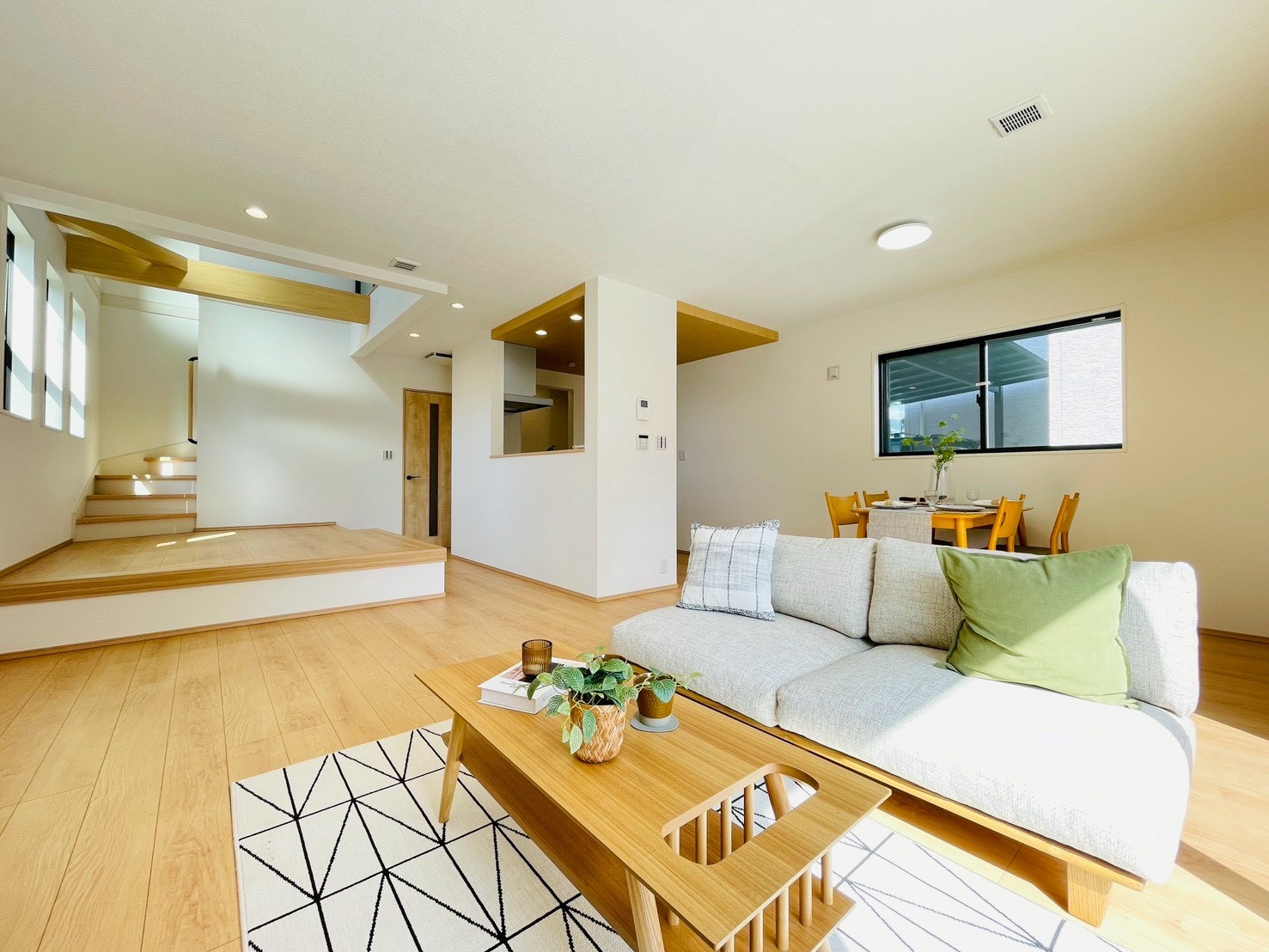 室内ではキッチンから見渡せる小上がりスペースに開放感と